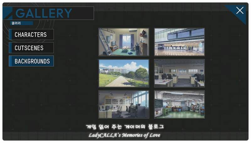 'GALLERY' 메뉴는 다시 CHARACTERS (캐릭터), CUTSCENES (컷씬), BACKGROUNDS (배경) 세 항목으로 나뉩니다.