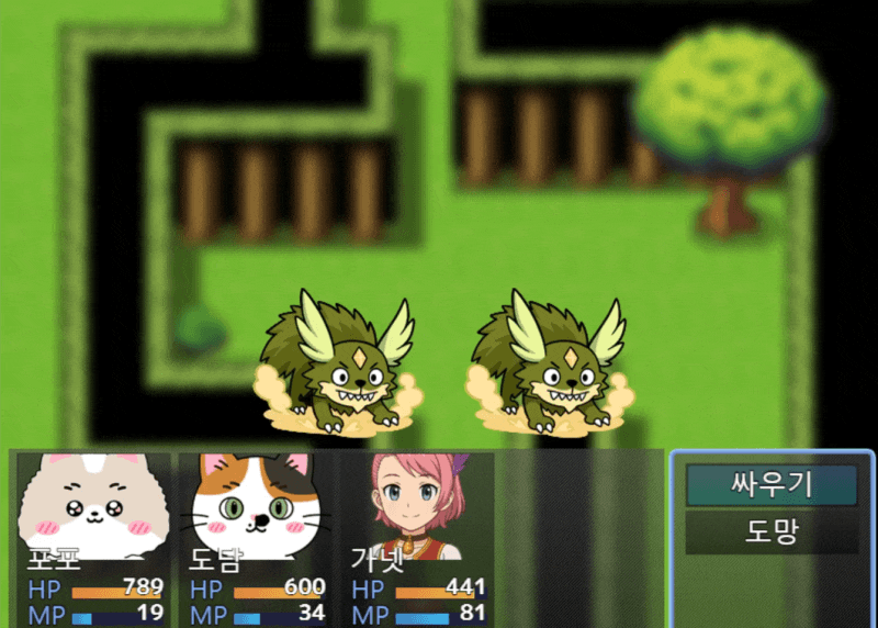 전투는 턴제로 진행되며, 포포와 도담, 가넷의 레벨이 오를수록 사용할 수 있는 필살기(스킬)의 종류도 늘어납니다.