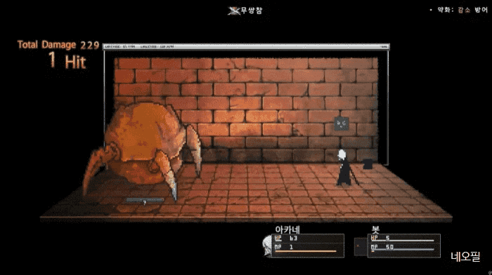 전투는 턴제로 진행되며 대체로 단순합니다. 아카네를 따라다니는 봇이 턴마다 힐을 주기 때문에, 너무 강한 상대가 아닌 이상 무난하게 이길 수 있고, 레벨도 몹 한두 마리 잡을 때마다 오르는 수준입니다.