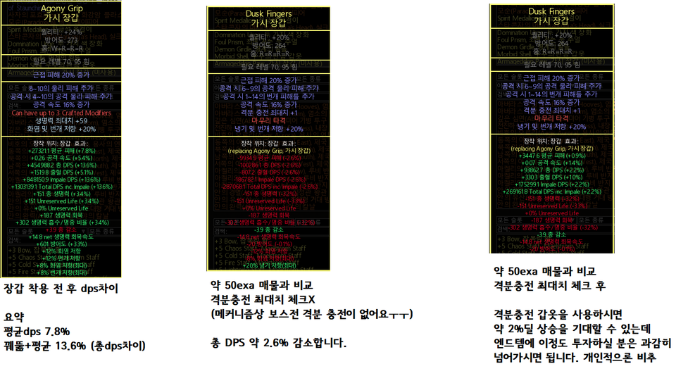 가격이 비싸다는 분들이 있는데 필요하시면 제외하고 거래 가능합니다. 단 딜이 100만정도 빠지니 참고해주세요!! (꿰뚫기 포함 dps가 -100만정도 차이가 납니다. 풀격분 시는 격분충전 장갑이 강하지만 일반 맵핑시외 단일보스전에는 격분 충전이 안 되는 빌드이니 무옵이라 생각하고 구성한 세팅입니다.)