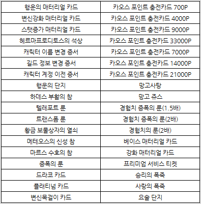 ※ “카오스 포인트 카드” 아이템은 복구되나, 이를 이용한 “카오스 포인트”는 복구되지 않습니다.