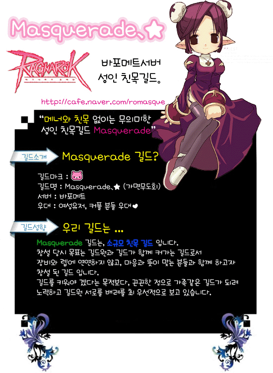 바포메트 서버 신생 친목길드 Masquerade 에서 새로운 식구를 모집 합니다.