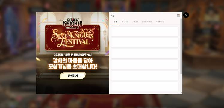 - 2025 세븐나이츠 페스티벌 개최 일정 및 내용은 상황에 따라 변경될 수 있으며, 변경 시 본 공지를 통해 안내해 드리도록 하겠습니다.