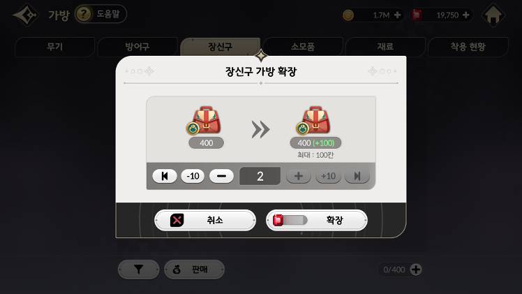 장신구 가방은 루비를 소모하여, 기존 최대 확장 한도에서 100칸을 추가로 늘리실 수 있도록 개선했습니다.