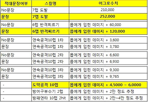 5. 스킬별 어그로 수치 측정 결과값 * 본수치는 이론적인 계산수치로 이 정도 어글이 있구나 정도로 봐주십시요.