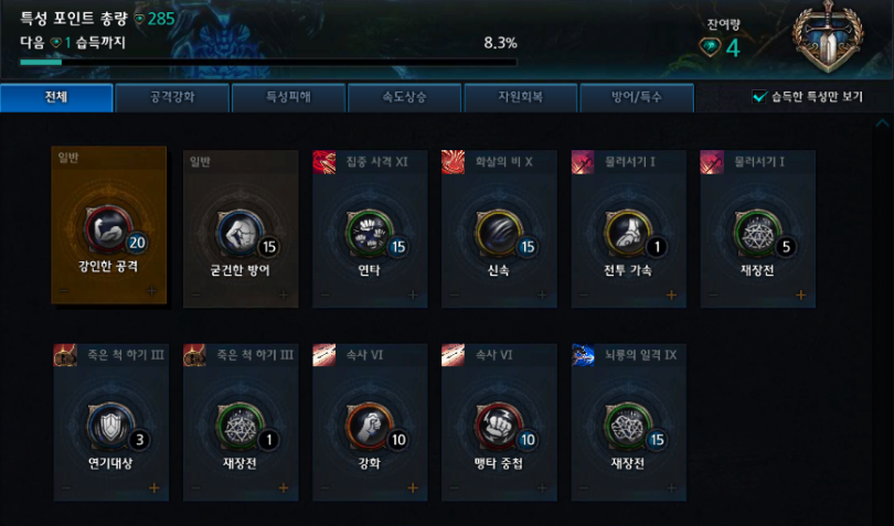 필수특성 전부 다 찍는데 특성렙 200 이나 199 둘중 하나에 다 찍을 수 있습니다.