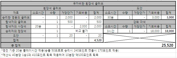 무자비한 흰장석 글러브 제작 비용 환산표(승리자 포인트 +5,000)