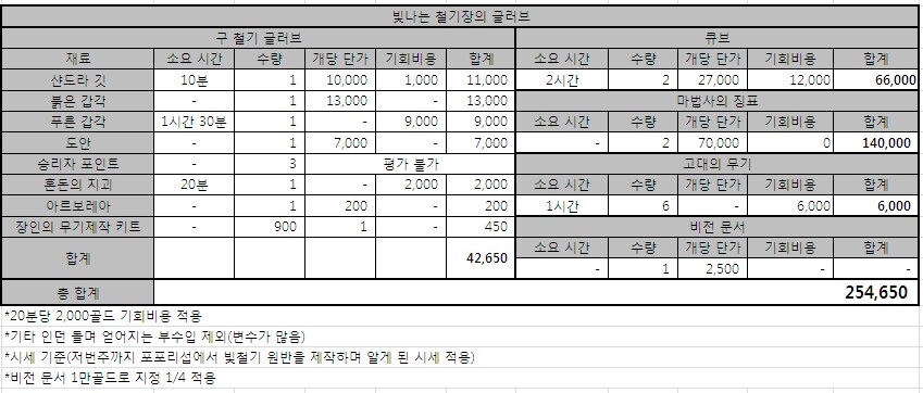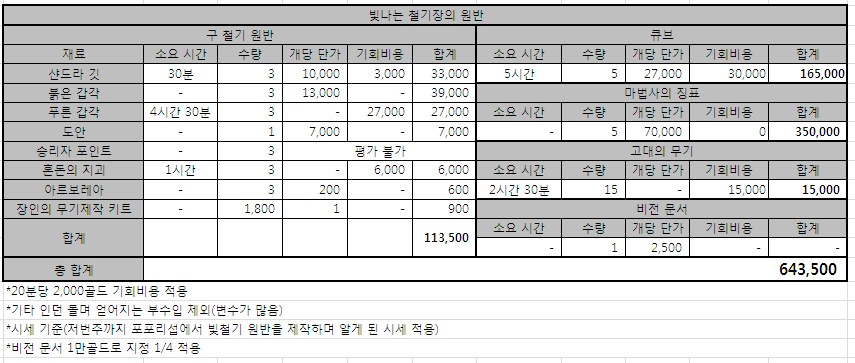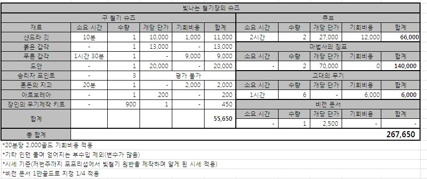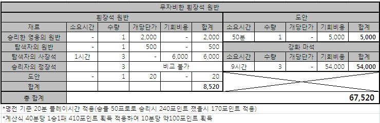 빛나는 철기장의 원반 제작 비용 환산표(승리자 포인트+9,000)