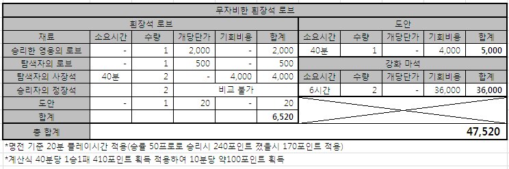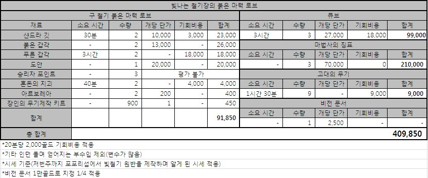 빛나는 철기장의 붉은 로브 제작 비용 환산표(승리자 포인트 +6,000)