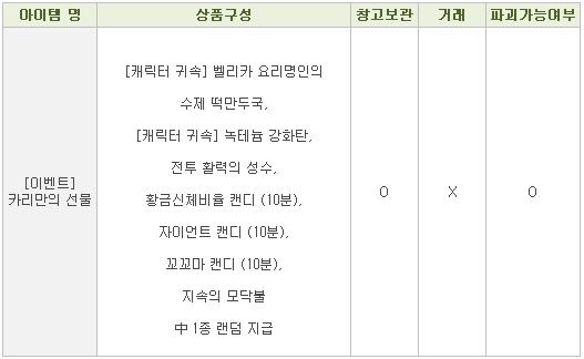 • 이벤트 기간동안 루키서버에서 우편을 통해 카리만의 선물을 드립니다.