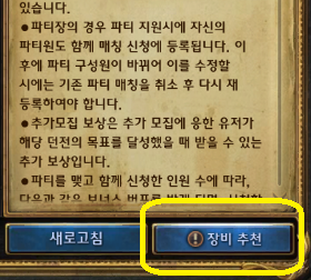 ▲ 인던 파티 매칭 버튼 클릭 ▲ 장비 추천 버튼 클릭