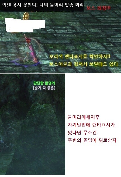 사방팔방 돌멩이투척 - 둥근원들이 보스주위로 깔리며 돌멩이가 날아오니 그주변에서 벗어나면 맞지않습니다