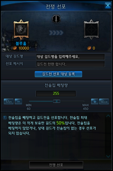 길드 현황에 배치된 길드전 선포 버튼을 클릭하면, 바로 선포창으로 이동됩니다.