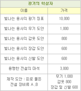 광기의 학살자 (패) | 220 (300) | 370 (260) | 1,190 (1,650) | 925 (375) |