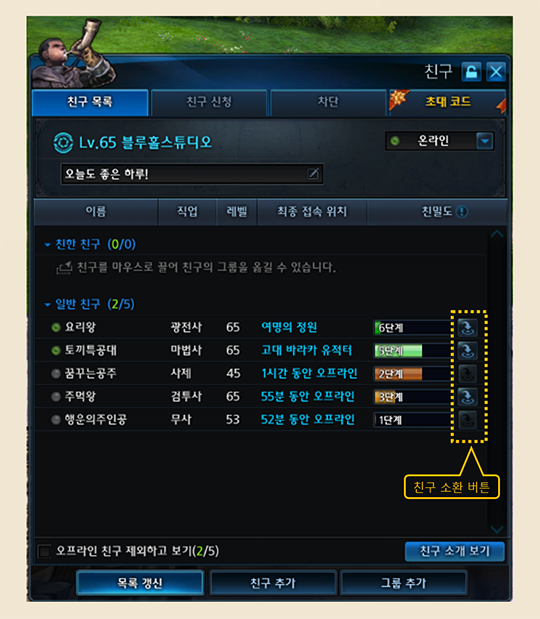 게임에 접속 후 친구 메뉴(U)에서 본인의 초대 코드를 확인하여 새로운 친구,