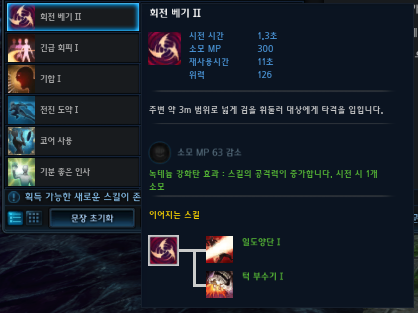 ▲ 스킬에 마우스를 올리면 툴팁 하단부에 이어지는 스킬이 표시됩니다