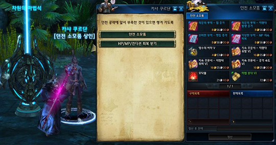 던전 입구에 각종 소모품을 판매하는 상인이 배치되며, 해당 상인은 6단계 지속 주문서 및, 부적과 비약 모닥불 등을 판매 합니다. 추가로, 마을에서만 이용할 수 있었던 HP/MP/컨디션 회복 기능도 이용 가능합니다.