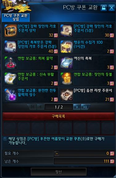 교환 가능한 아이템 목록 중에서 금번에 새롭게 추가된 ‘강화 장인의 가호 주문서’ 라는 아이템이 있습니다. 아이템 사용 시 일정 시간 동안 강화 확률을 증가시켜 주는 아이템입니다. 강화에 어려움을 겪으시는 분들은, PC방에서 꾸준한 플레이를 통해 아이템을 획득하여 도움을 받아보면 어떨까요?
