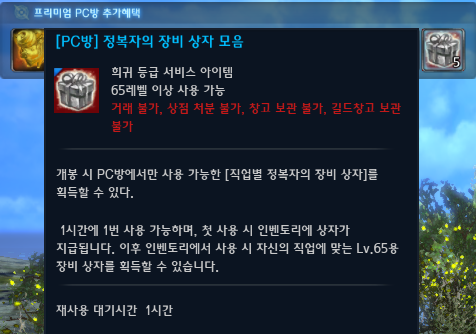 해당 장비는 PC방 전용 인벤토리에서 상자 버튼을 우클릭하면 획득 가능하며, 각 직업에 맞는 장비를 자동으로 지급합니다. 단, PC방 이외의 지역에서 접속할 경우, 해당 장비는 사라지며 장착하고 있던 크리스탈 또는 아티팩트는 우편으로 되돌려 드립니다.