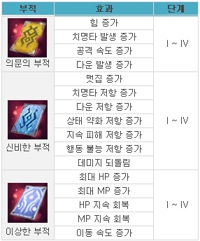 의문의 부적은 공격과 관련한 효과를, 신비한 부적은 방어관련 효과를,