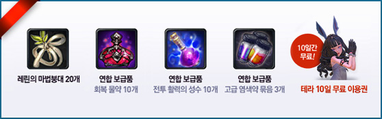 • 10일 무료이용권을 사용하여 게임에 접속하면, 여신의 선물을 통해 선물꾸러미 수령이 가능합니다.
