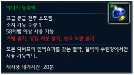 에너지 농축액은 단 1개만 소지할 수 있으며 효과 지속 시간 3분, 재사용 대기시간 20분의