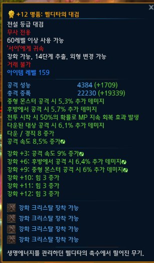 과거로 따지면 이게 회당템급라고 보면 됨. 뒤섞인이 재탄급.14단계로 벌서부터 12강이 드문드문 나오기 시작 함. 더욱이 방어구의 경우10강이상 옵션 조정가능. 일전 패치의 국민템이 회당템이었다면 이번 패치의 국민템은 멜디타가 될 것으로 보인다. 모든 신던을 클리어 할 수 있는 템이면서 던전에 따라 쉽게 깰 수 있는 성능을 갖고 있는 템은 멜디타이기 때문. 그러나 국민템으로 될 때까진 아직은 많은 시일이 필요 할 것으로 보임.