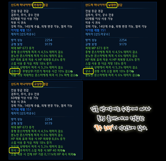 방어구에 각인된 특수 능력은 수식어에 따라 특정 클래스에게 적합한 효과가 적용되어 있습니다.