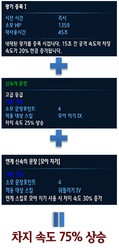 시간의 문장을 함께 적용 시 광기 증폭의 지속시간이 약 20초로 유지 시간이 향상됩니다.