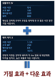 뒤돌리기와 대지치기를 연계스킬로 사용 시 효과