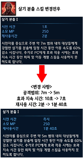 3.살기 분출 스킬 변경 √ 공격범위 변경: 7m -> 5m √ 효과 시간 감소: 10초 -> 7초 √ 재사용 시간 변경: 2분 -> 1분 40초