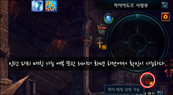 인던 파티 매칭 시스템은 게임 화면 우측 상단에 있는 버튼을 누르면
