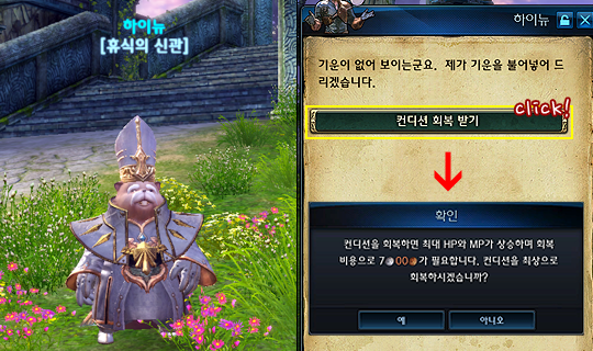 ▼ 휴식의 신관/신장 NPC에게 골드를 지불하고 컨디션, HP, MP를 회복받을 수 있습니다.