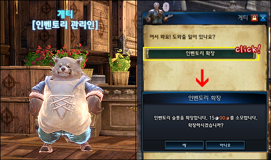 ▼ 대도시에 있는 인벤토리 관리인 NPC에게서 소정의 골드를 지불하고 확장할 수 있습니다.