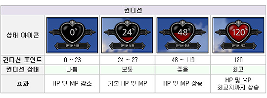 캐릭터의 컨디션 상태에 따라 기본 HP 및 MP 수치가 변화되는데,