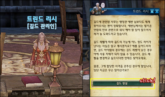 길드 창설은 대도시 길드 관리인과 대화하여 신청할 수 있습니다.