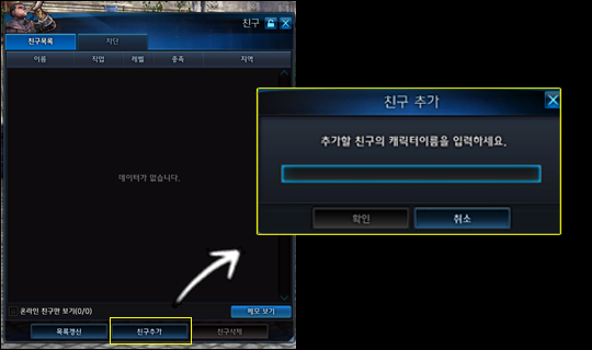 채팅창을 이용하시어 [/친구추가 캐릭터명]을 기재하시면 친구(U)에 등록됩니다.