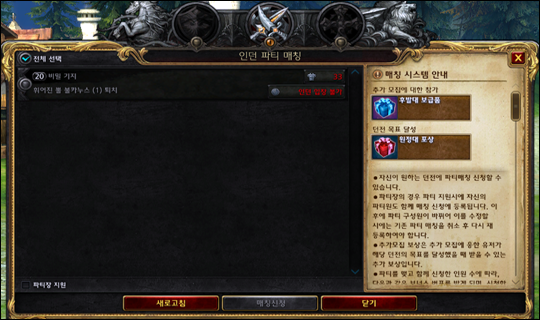원하는 인스턴스 던전을 선택하고 파티 매칭을 진행하실 수 있으며,