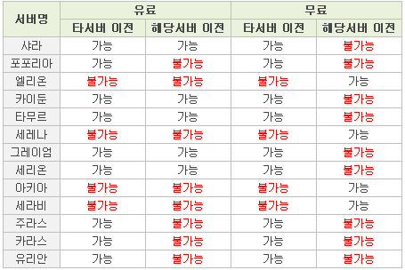 ※ 각 서버의 인구 현황에 따라 추후 서버 이전 가능 여부가 변경될 수 있습니다.