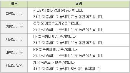• 그 밖에 필드에서 채집 수행 시 전투에 작은 도움을 주는 버프를 획득할 수 있습니다.