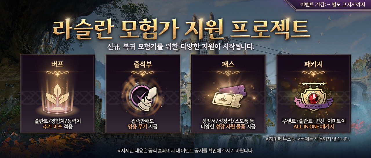 - 라슬란 지원 버프는 신규/복귀 계정 상태가 유지되는 14일간만 유지되며, 이후 다시 복귀 계정이 될 경우 동일하게 버프가 적용됩니다.