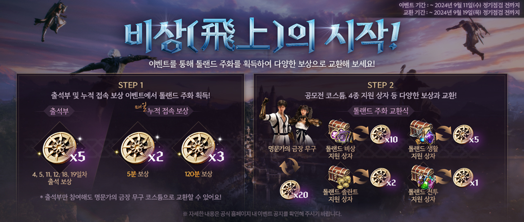 - 드디어 밝혀지는 미지의 땅, 톨랜드에서 출석부와 누적 접속 보상 이벤트가 시작됩니다.