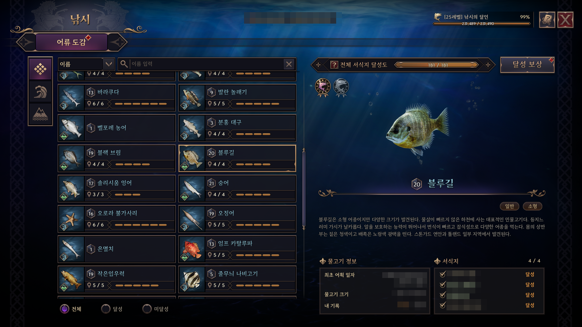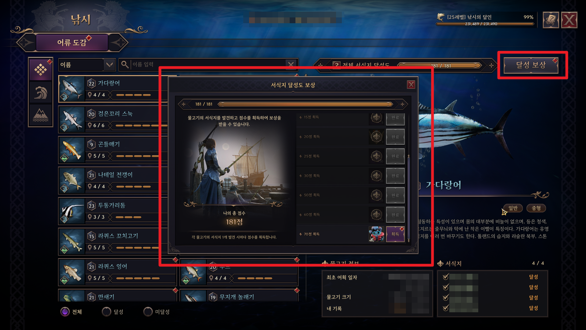 - 발견한 물고기 서식지에 따라 전체 서식지 달성도가 오르게 되며, 일정 수치마다 보상을 획득할 수 있습니다.