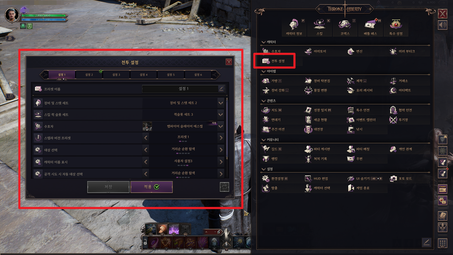 - 전투 설정에는 최대 6개의 설정 프리셋이 제공되며, 여러 창에 흩어져 있는 설정을 저장할 수 있습니다.