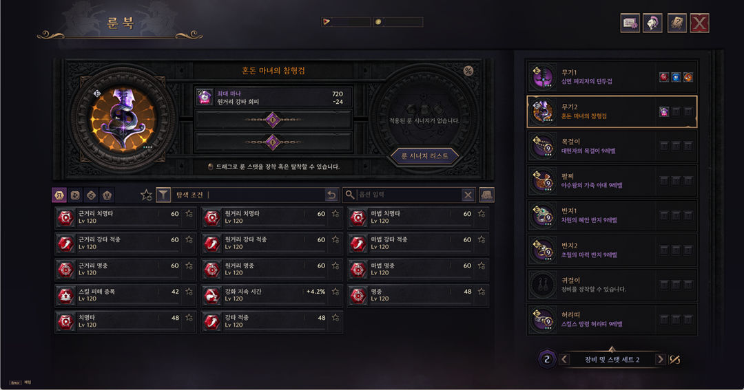 > 룬 북 UI가 기존 가방 영역 대신 장비 및 스탯 세트별 장착 슬롯이 보이도록 변경됩니다.