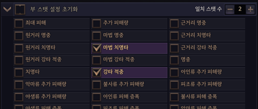 아티팩트 하나에 설정한 부 스탯 중 2개 이상 일치하는 아티팩트만 필터링하여 보여줍니다.