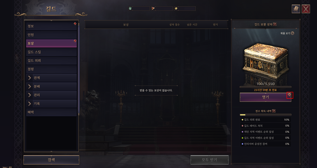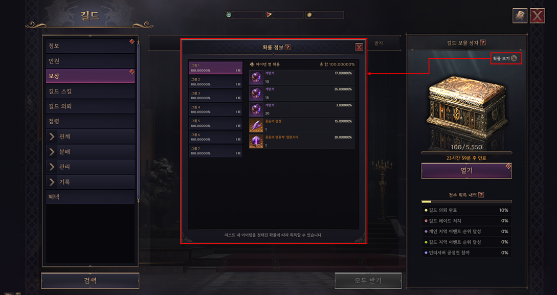- 확률 보기 버튼이 추가되어, 길드 보물 상자에서 획득 가능한 아이템 리스트를 확인할 수 있습니다.
