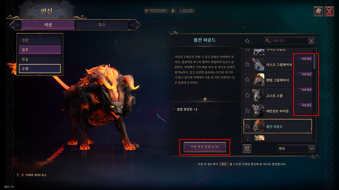 - 야성 변신에서 지정 변신을 최대 10개까지 등록할 수 있도록 변경되고, 변신 시, 지정 변신 중 1개를 랜덤하게 선택해서 변신하도록 변경되었습니다.