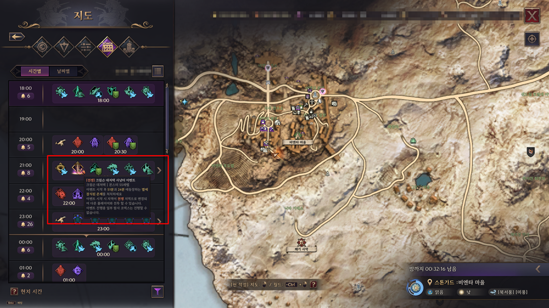 - 사냥터 이벤트 일정은 ‘지도 – 일정표’에서 확인할 수 있습니다.
