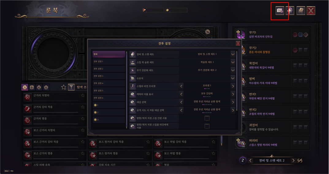 > 룬 프리셋이 장비 및 스탯 세트와 연동됨에 따라 전투 설정 창을 바로 열 수 있도록 룬 북 창 우측 상단에 전투 설정 프리셋 버튼을 추가하였습니다.